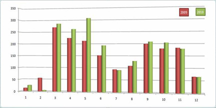 1. 春節的影響最大,兩年的情況都是:春節所在的半月,全國幾乎沒有專業展會。圖上2010年系列在6、7周幾乎沒有會,而2009年系列在4、5周幾乎沒有會,這段時間對應相應的春節。并且2010年由于春節的推后,導致其展會的恢復在第10周才開始,而09年是第8周就開始了。(當然還有天氣回暖的原因)。