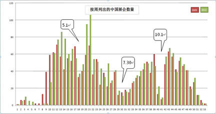 好展會從自身數據庫中檢索了2009年、2010年的展會情況,把開展日期按周分組,得到了本圖。