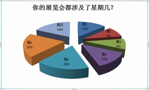 本報告還對每個展會涉及一周的哪幾天進行了統計(統計工作量很大,但邏輯很簡單,就是對每個展覽會,每天算一遍,看屬于哪一天),下表是統計的數據,您可以看到:20%的展會都會有周六的一天,而作為對比,涉及了周二、周三的比例只有9%。
