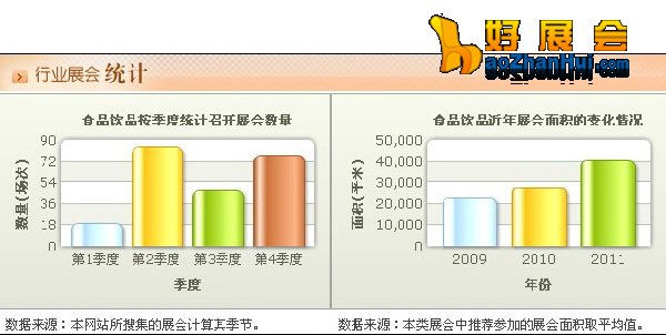 由此我們可以發(fā)現(xiàn):第一季度和第三季度展會較少,而第三季度和第四季度展會明顯比一三季度多。同時還可以發(fā)現(xiàn)在09年-11年中,食品展會的面積呈直線上升狀態(tài),且有越演越烈的趨勢。