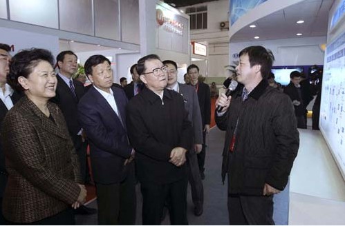 下午5時許,李長春走進展廳,饒有興致地參觀了直播衛星“戶戶通”工程、中國3D電視試驗頻道展示,了解國家新媒體集成播控總平臺建設、中國移動多媒體廣播(CMMB)交互業務技術應用情況,觀看了面向三網融合的互聯互通業務平臺、基于下一代廣播電視網的網絡解決方案、視頻云計算和智能云電視等新成果,對廣播電視系統近年來加快構建廣播電視公共服務體系、推進科技創新、建設現代傳播體系取得的成績給予充分肯定。在浪潮集團、中國有線公司等國內技術設備企業展臺,李長春詳細了解企業開發生產具有核心技術和自主知識產權的廣播電視設備情況,勉勵企業通過原始創新、集成創新、引進消化吸收再創新,加快自主創新步伐,積極參與廣播電視數字化、網絡化改造,為推進三網融合和國家新媒體集成播控平臺建設提供技術支撐。
