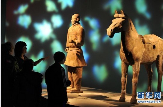 4月25日,觀眾在美國紐約參觀展出的中國秦朝兵馬俑。當天,以兵馬俑為主題的“兵馬俑:中國始皇帝的衛兵”主題展覽在紐約舉行預展,包括秦始皇兵馬俑在內的數百件國家級文物展出。這是紐約首次舉行以兵馬俑為主題的展覽。展覽將于27日向公眾開放。(來源:新華網)