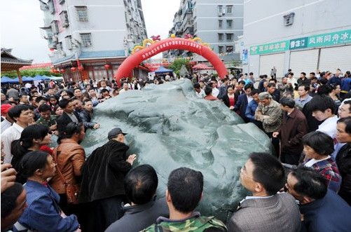 石博會在當(dāng)?shù)匚幕中V場舉行了最美貴州青觀賞石拍賣會,現(xiàn)場競拍“鴻運(yùn)當(dāng)頭”、“洞天福地”、“雙喜臨門”、“回娘家”、“泰坦尼克號”等11尊貴州青,金額達(dá)1358.2萬元。一方40多噸重的“江山多嬌”貴州青,200萬元起拍,最終由奇石愛好者袁女士以1000萬元高價(jià)拍得。