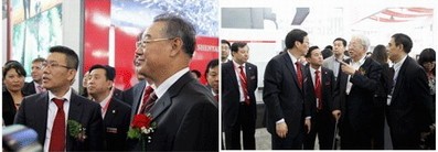 (左圖:中國機械工業聯合會會長王瑞祥觀看昆機展品。右圖:原機械工業部副部長陸燕蓀了解昆機產品性能。)