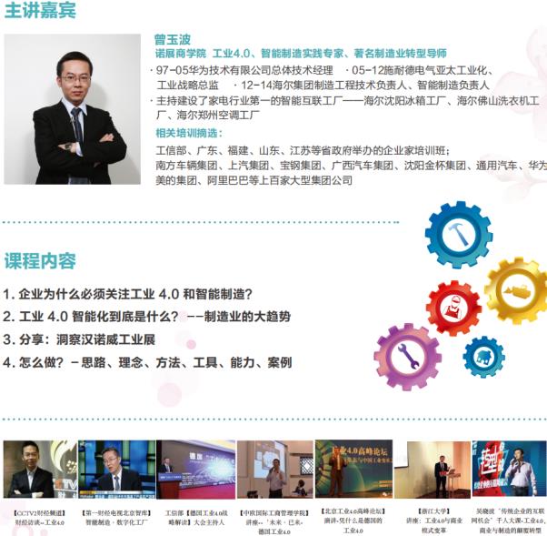 2018年金諾濟南機床展開展在即,配套推出《工業4.0與企業智能化轉型》培訓課程,由榮登央視的智能制造實踐專家、著名制造業轉型導師曾玉波親臨現場,進行授課與指導。