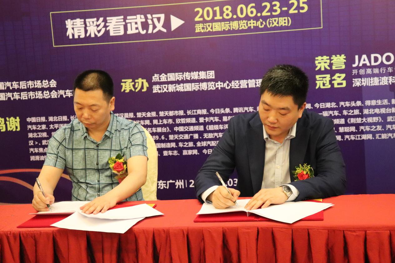 隨后的戰略簽約和戰略授牌儀式中,首先是點金傳媒譚校長與JADO捷渡智能(中國)王杰董事長兩位代表正式簽約,宣布雙方達成2018武漢展及后續的戰略合作。