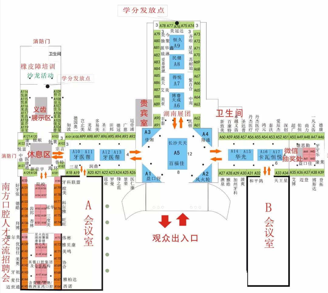 A會議室、B會議室、湖南展團(tuán)區(qū)、人才招聘區(qū)、義齒展示區(qū)、微信抽獎(jiǎng)區(qū)、沙龍活動區(qū)、休息區(qū)、學(xué)分發(fā)放點(diǎn)