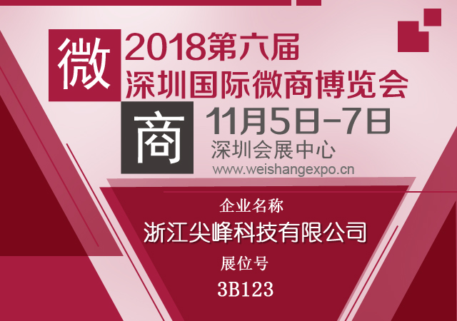 導讀:第六屆深圳國際微商博覽會將于2018年11月5-7日在深圳會展中心盛大開幕!浙江尖峰健康科技有限公司(JFHEALTH) 將攜旗下舒尼維等產品于3B123展位展出!