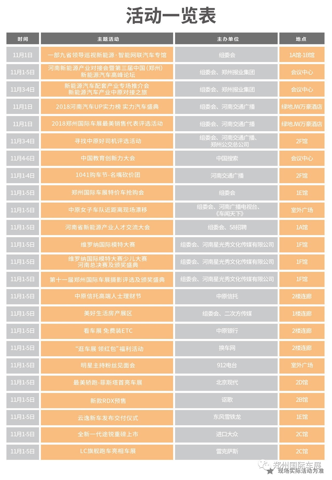 溫馨提醒:11月3日(周六),與車展同期舉辦的2018鄭州國際馬拉松賽事,將對商務內環路部分路段臨時封閉,請提前規劃觀展時間,開車觀展的可停在商務外環各地下停車場,小展建議最好搭乘公共交通方便出行。