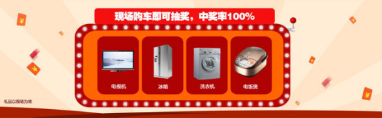 現場購車的觀眾,可憑購車合同、付款憑證以及個人身份證,即可參與購車抽獎,“超薄電視機”、“品牌冰箱”、“洗衣機”等多重豪禮等你來拿!獎品豐厚,中獎率為100%!