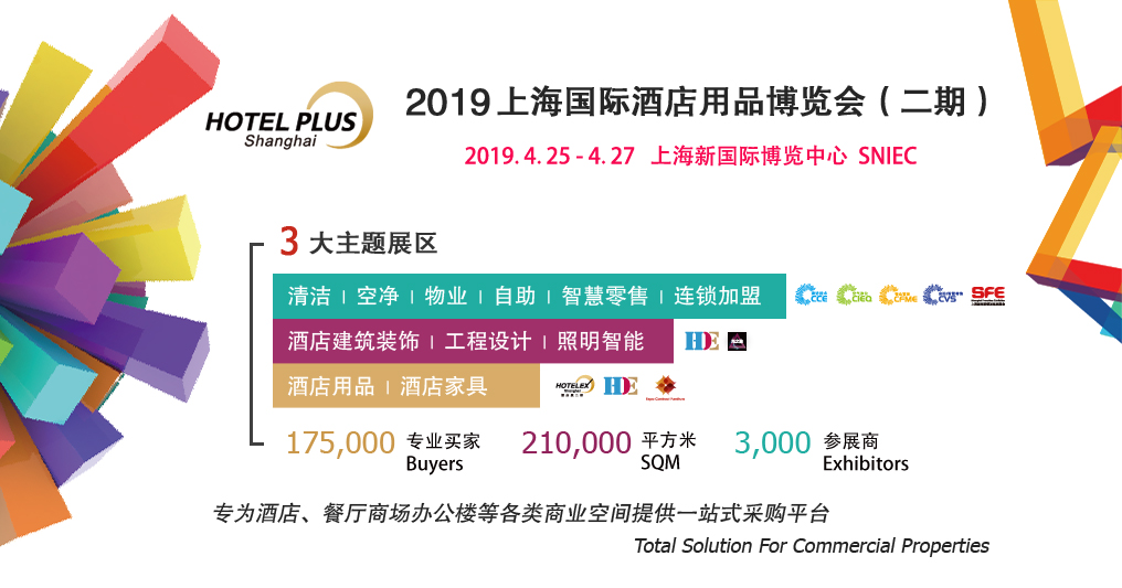 2019新國際博覽中心再度全館齊放,打通行業壁壘,共享210,000平方米展出面積,175,000觀眾資源,近3,000優質海內外廠商。同期展會貫穿酒店工程、清潔產品、物業保潔、建筑裝飾、商業智能化設備等行業,定位于中高端產品,為全球買家提供全系列解決方案和信息交流與分享的機會,為酒店、餐廳、商場辦公樓等各類商業空間提供服務及整體解決方案的一站式采購平臺。