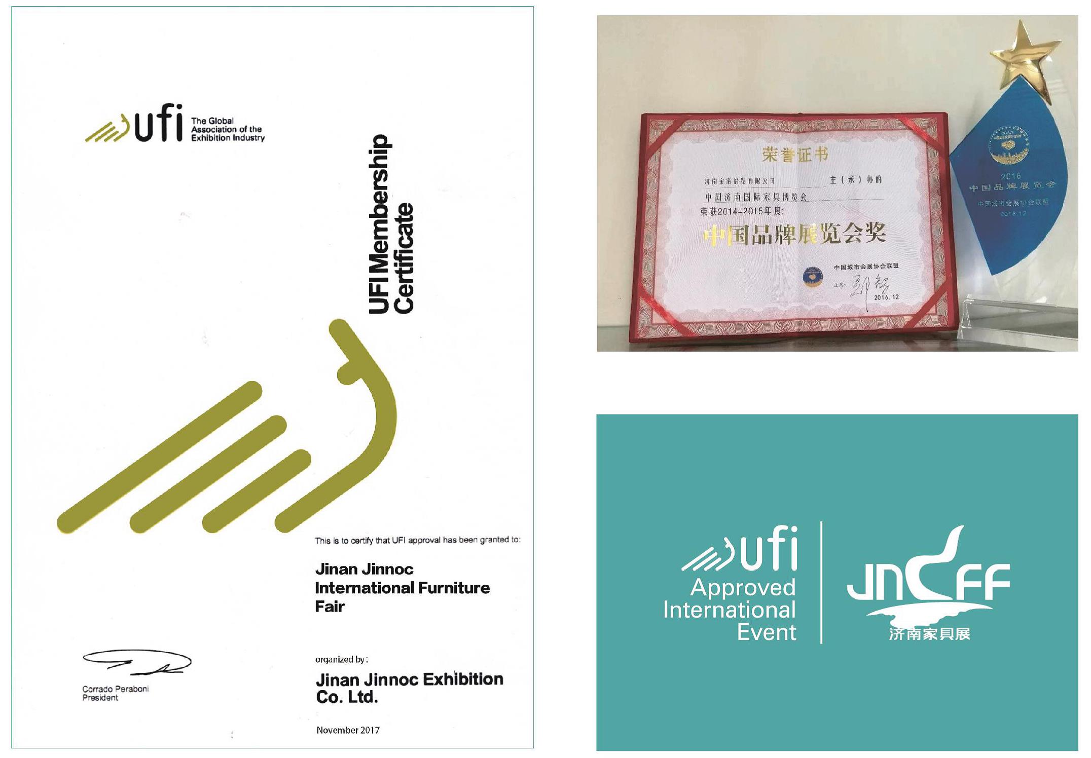 “濟南國際家具博覽會”于2016年在中國(重慶)城市會展業合作發展論壇暨2016中國城市會展協會聯盟峰會上榮膺“2016中國品牌展覽會”殊榮。2017年11月1日,在第84屆國際展覽業協會年會上通過了全球國際展覽業協會執行委員會的審核,成為了UFI的正式會員,“濟南國際家具博覽會”被授予 “UFI認證的國際展覽會”。 “濟南國際家具博覽會”獲得UFI認證在展會發展歷程上具有里程碑意義,這是山東省內第一個獲得UFI認證的家具類專業展會。