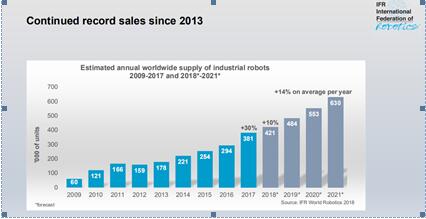 今年10月,國際機器人聯盟(IFR)在日本東京舉行的“World Robot Summit 2018”記者招待會上公布了每年都會發行的“The World Robotics Report”,根據報告顯示,全球工業用機器人領域投資將持續增加。從2013年到2017年,全世界工業用機器人的銷量增加了2倍,2018至2021年,年平均增長率為14%。汽車、電子、金屬工業等領域機器人自動化的需求持續增加,不論大企業還是中小型企業均對自動化表現出極大的興趣,愿意嘗試借勢機器人轉型,讓企業搭上智能制造快車。