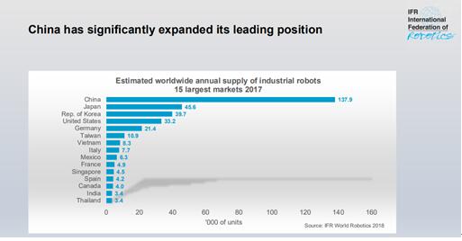 2017年,占據全球機器人市場份額73%的5個國家依次是中國、日本、韓國、美國、德國。其中,中國工業機器人的銷量達到137.9萬臺,占據了世界供應量的36%,進一步鞏固了第一大市場的位置。2013年至2017年,中國已連續五年成為全球最大的工業機器人應用市場。據預計,到2020年我國機器人市場規模將進一步擴大到2000億元,工業機器人發展一片“火熱”景象。