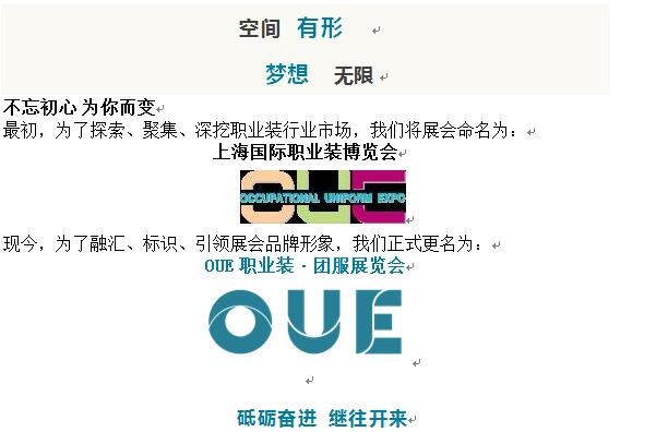 您好,當您打開這封信時,我們的緣分就此種下。十分感謝您關(guān)注OUE職業(yè)裝·團服展覽會(原稱:上海國際職業(yè)裝博覽會),細心的您一定發(fā)現(xiàn)我們展會對外展示形象有所變化了。為了解答您的所有疑惑,我們誠摯地寫下這份書信,向您介紹OUE職業(yè)裝·團服展的“前世今生”。