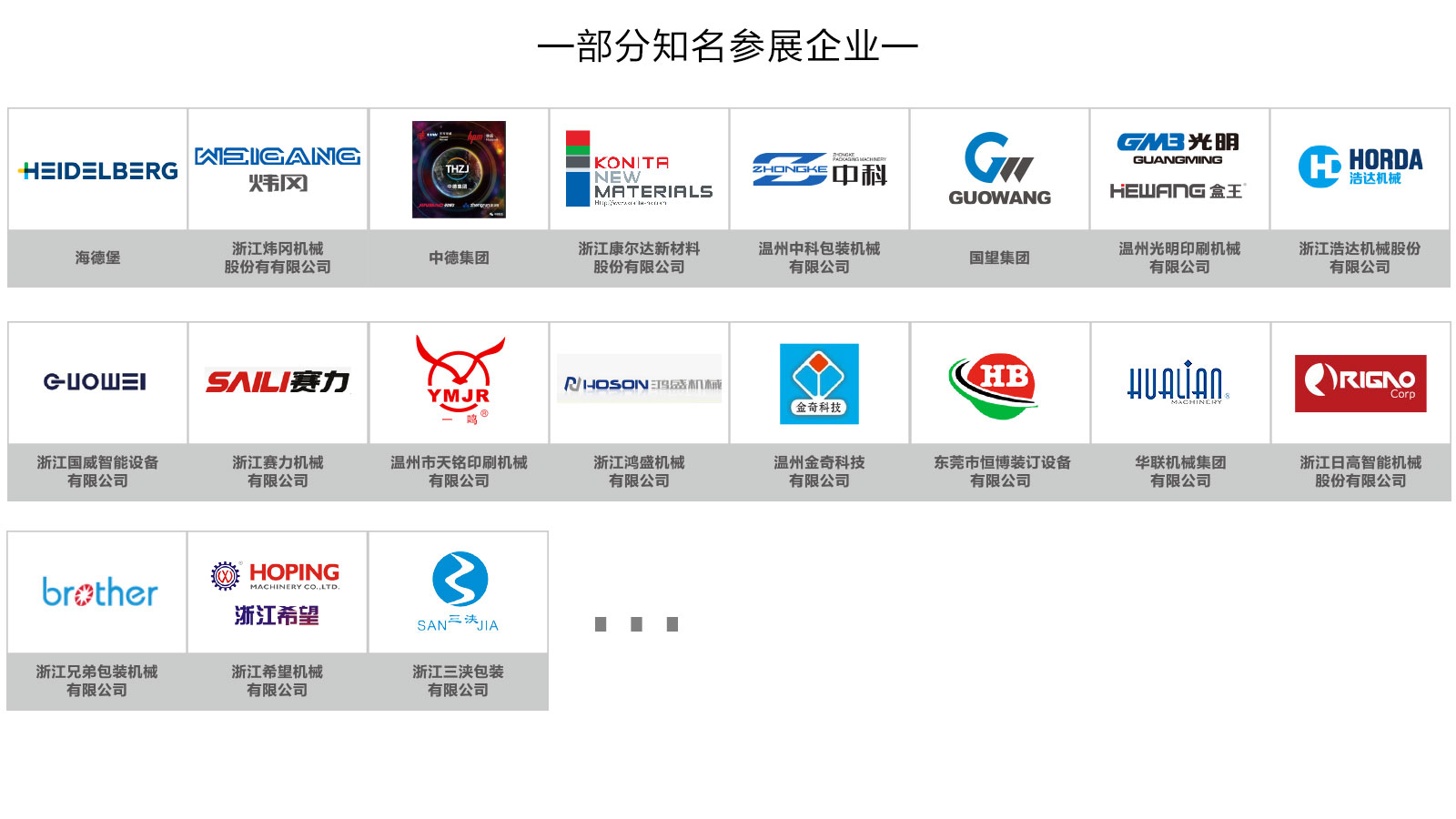 展會依托溫州——“中國印刷城”、“中國包裝機械城”、“中國印刷材料交易中心”、“中國印刷設備制造業第一區域品牌”、全球優質制造商聚集地產業高地優勢和強勁的市場需求,吸引國內外知名企業、品牌參展,展會展出產品涵蓋印刷、包裝、廣告標識、數碼印花、圖文快印等品類。海德堡、煒岡、中德、康爾達、中科、國望、光明、浩達、國威、賽力、天銘等印刷行業龍頭企業悉數參與展會;“智能包裝產業技術聯盟”成員華聯、日高、希望以及兄弟、三浹等包裝設備知名企業將攜新品展出;此外,博印、金奇、明睿等數碼印花、圖文快印、廣告標識企業也將共襄盛會。