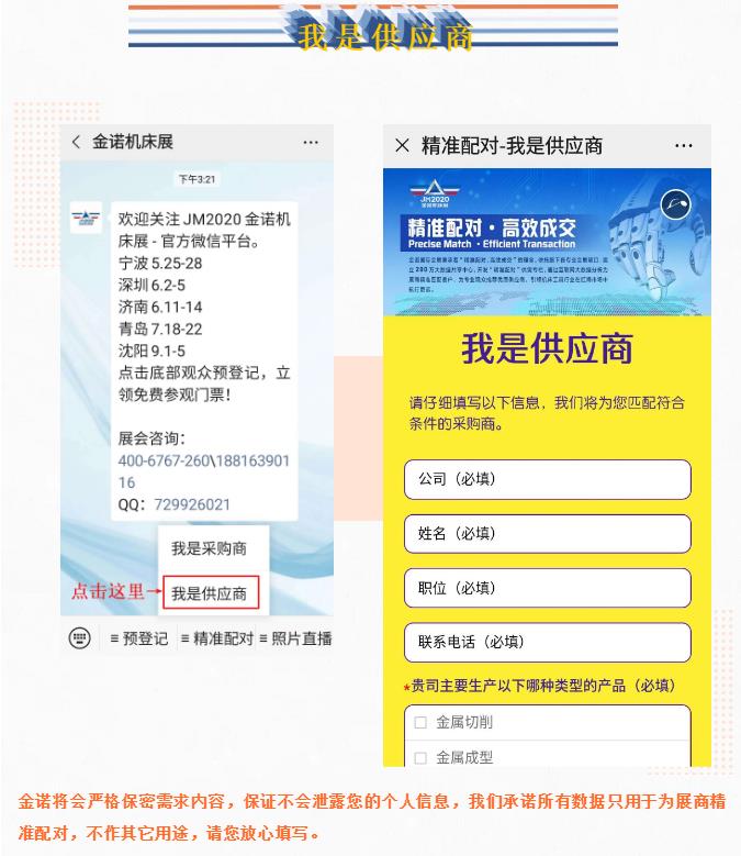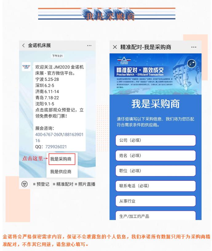 考慮到突發的疫情可能為您的觀展或采購造成不便,為了給您帶來最舒適的采購體驗,節省您的采購時間,找到更適合的產品,金諾機床展托旗下各專業會展項目,建立200萬大數據共享中心,開發“精準配對”供需專欄,通過互聯網大數據分析為展商精準匹配客戶,為專業觀眾推薦優質供應商,引領機床工具行業在紅海市場中航行更遠。