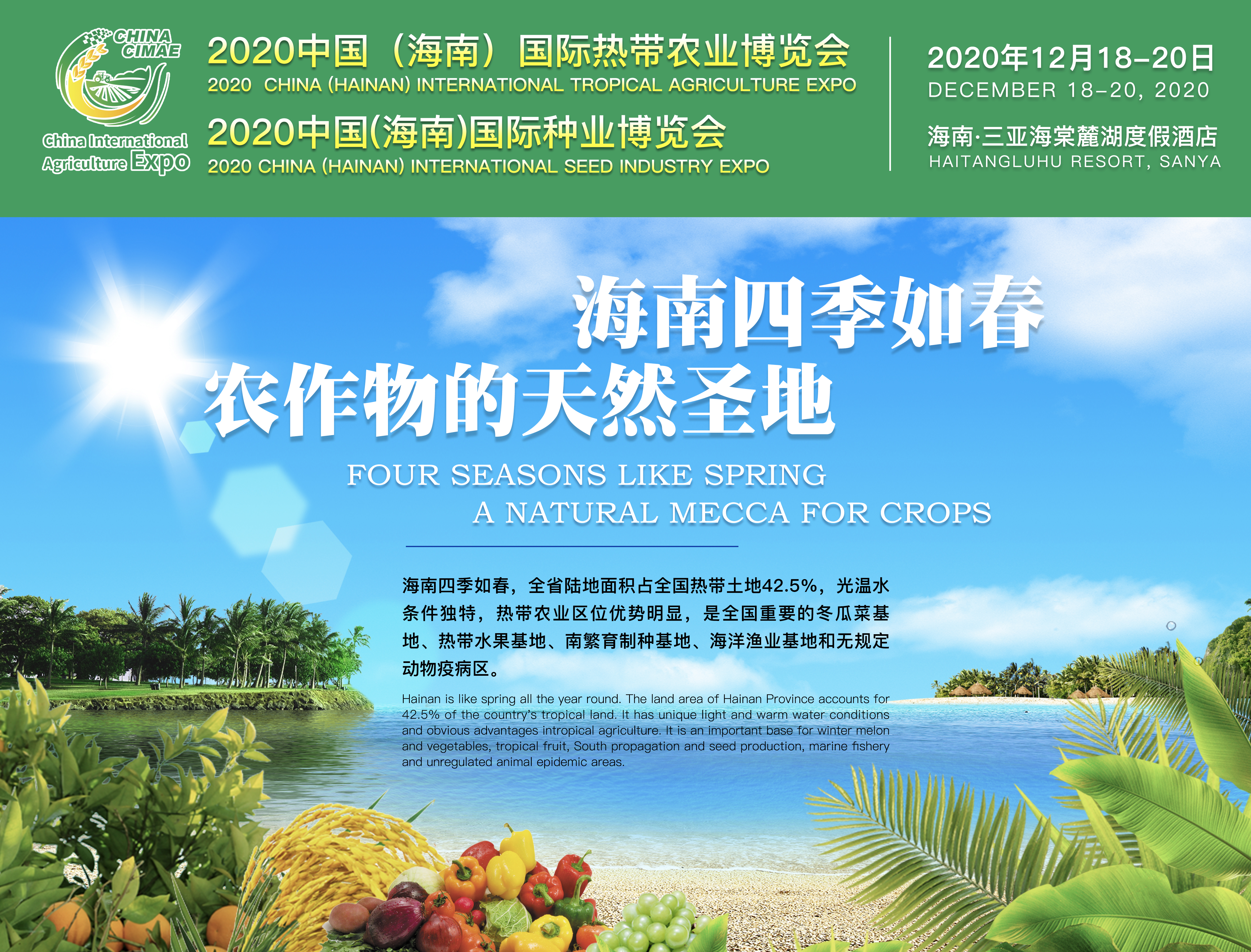 據悉,本次展會將于12月18-20日在海南三亞舉辦,預計展出面積30000平方米,將有來自國內外300多家品牌企業及20000多名專業觀眾前來參展參觀、交流采購,200多家權威媒體對展會進行宣傳報道。大會同期還將舉辦產業發展論壇、技術研討、供需對接、田間展示等一系列活動。作為農業領域的行業盛會,本屆展會必將會為我國農業的快速發展做出積極貢獻。