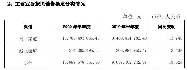 海天味業(yè)線上業(yè)務(wù)加快發(fā)展,從而使電商平臺和傳統(tǒng)渠道有效的結(jié)合,鞏固了公司在渠道和終端上的競爭優(yōu)勢。2020上半年,分銷售渠道來看,線下渠道營收破百億,約為107.83億元,同比增長13.74%;線上渠道營收2.14億元,同比增長3.43%。