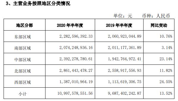 分區(qū)域來看,北部區(qū)域營收28.61億元,同比增長11.82%,營收最多;其次分別為中部、東部、南部、西部區(qū)域,營收分別為23.92億元、22.83億元、20.74億元、13.87億元,同比增幅分別為23.14%、10.76%、3.14%、24.55%,西部區(qū)域營收增長最快。除南部區(qū)域外,其余4大區(qū)域營收均實現(xiàn)了雙位數(shù)增長。