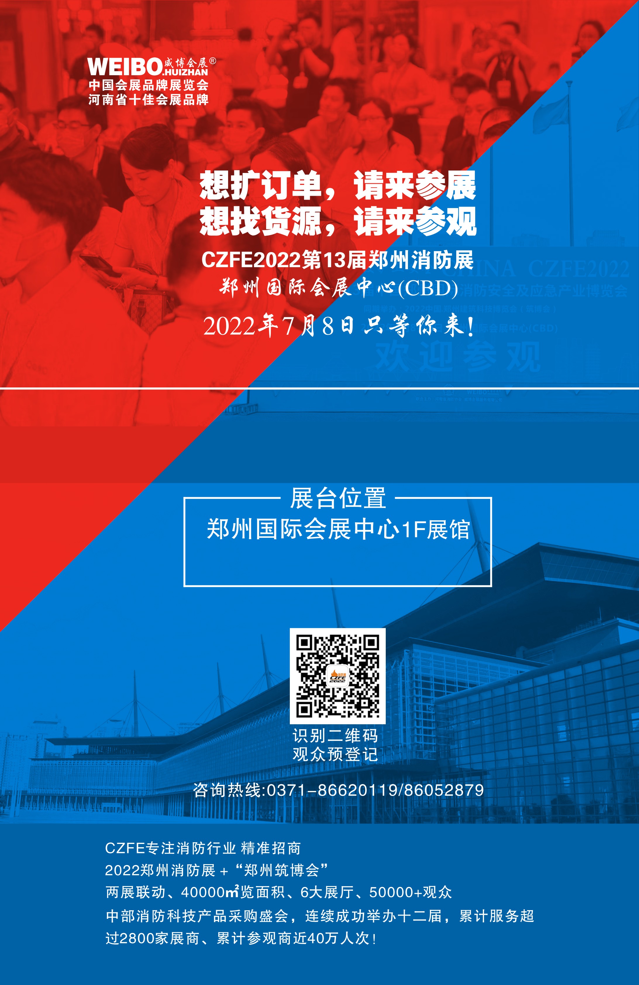 2022年7月8-10日,在鄭州國際會展中心(CBD)由威博會展旗下舉辦的“2022中國.鄭州消防安全與應(yīng)急產(chǎn)業(yè)博覽會& 2022中國.鄭州建筑防火與耐火/阻燃材料展(CZFE鄭州消防展)”將與“2022中國.鄭州裝配式建筑與建筑科技產(chǎn)品博覽會(筑博會)”聯(lián)袂舉辦。