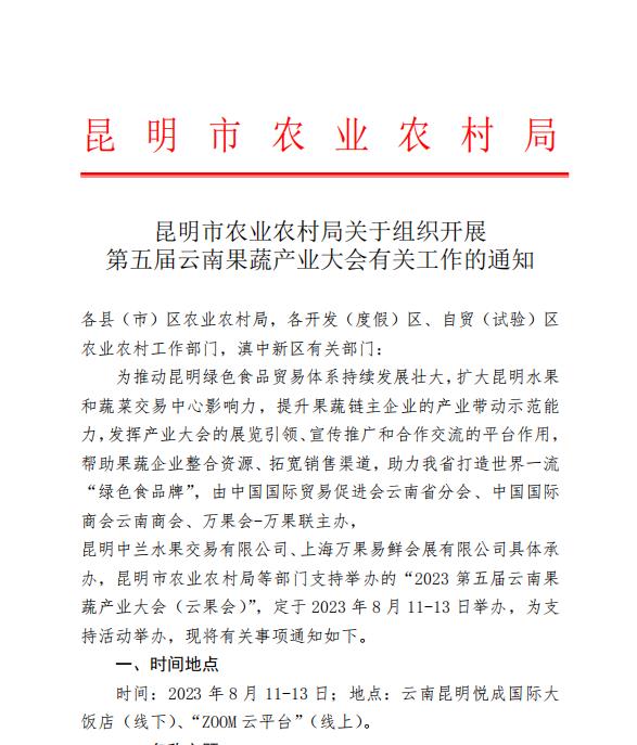 為推動昆明綠色食品貿易體系持續發展壯大,擴大昆明水果和蔬菜交易中心影響力,提升果蔬鏈主企業的產業帶動示范能力,發揮產業大會的展覽引領、宣傳推廣和合作交流的平臺作用,幫助果蔬企業整合資源、拓寬銷售渠道,助力我省打造世界一流“綠色食品牌”,由中國國際貿易促進會云南省分會、中國國際商會云南商會、萬果會-萬果聯主辦,昆明中蘭水果交易有限公司、上海萬果易鮮會展有限公司具體承辦,昆明市農業農村局等部門支持舉辦的“2023 第五屆云南果蔬產業大會 (云果會)”,定于 2023 年8月 11-13 日舉辦,為支持活動舉辦,現將有關事項通知如下。