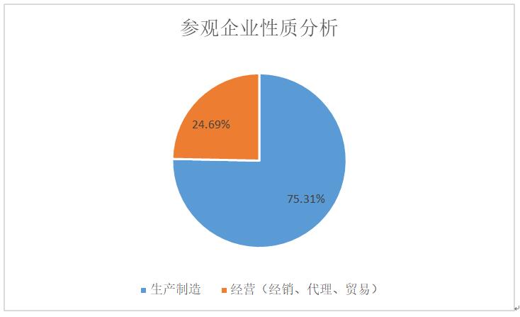 據展會組委會統計,本次展會參觀企業達6341家,從企業性質總數量占比來看,生產制造企業占75.31%,經營(經銷、代理、貿易)企業占24.69%,兩者合計占100%。由此可以看出,在參觀企業中,以生產制造企業為主,占比較大。