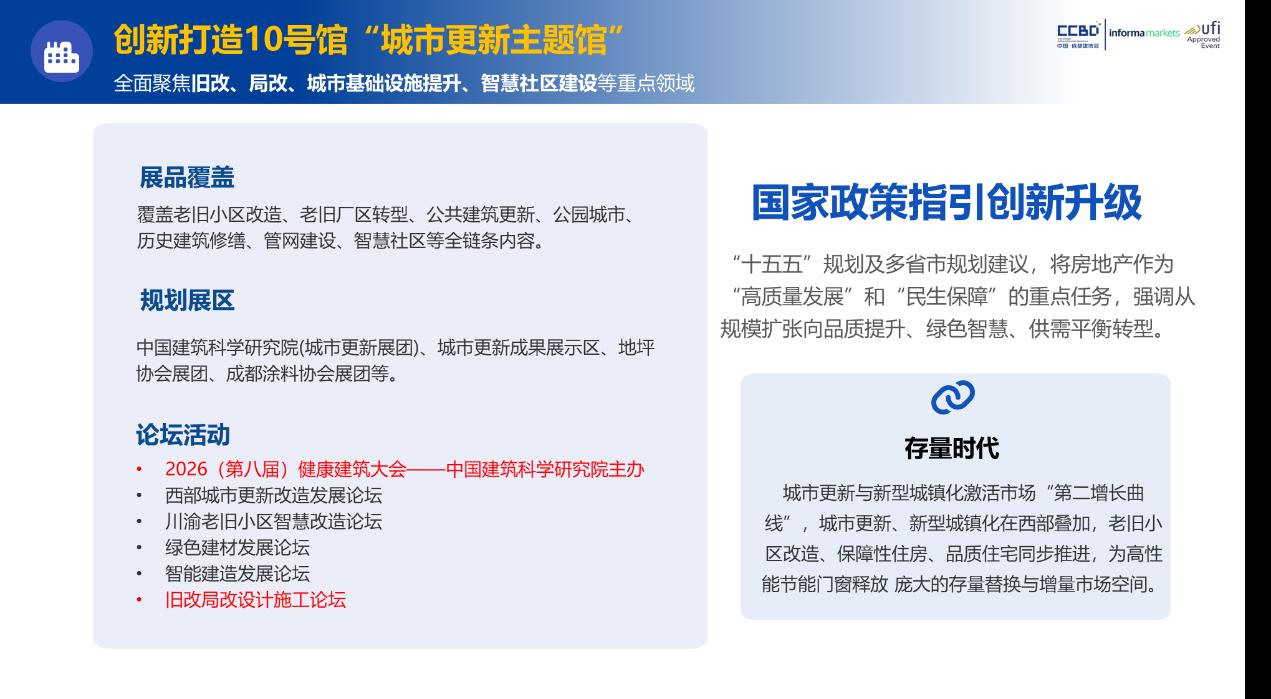 城市更新已成為驅動城市可持續發展的核心引擎。川渝地區存量房市場規模突破10億平方米,舊改、局改政策持續落地,釋放出巨大市場潛力。2026中國成都建博會精準把握這一戰略機遇,傾力打造10號館城市更新主題館,聚焦舊城改造、局部更新、城市基礎設施提升、智慧社區建設四大核心領域,為產業鏈上下游企業搭建起對接中西部市場的專業橋梁。