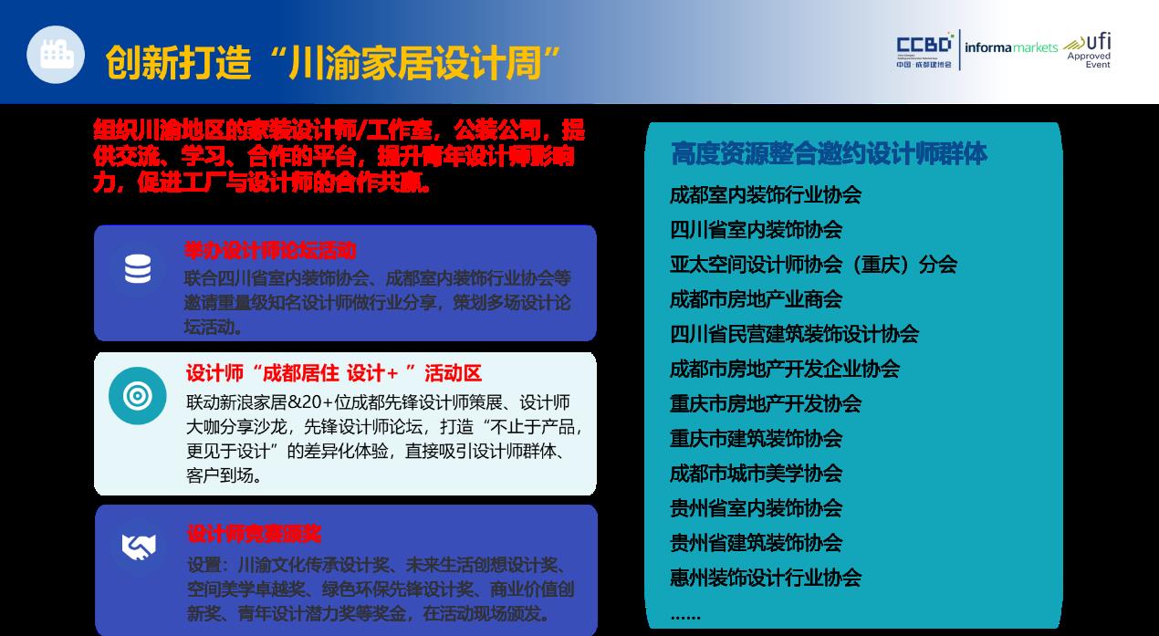 展會還將攜手新浪家居及20余位成都先鋒設計師聯合策展,通過設計師大咖分享沙龍、先鋒設計師論壇等活動,打造“不止于產品,更見于設計”的差異化體驗,精準吸引設計師群體與優質客戶到場交流。設計周特設新材料、新工藝區、創意概念區、設計師作品區三大特色展區,全方位展現行業前沿趨勢與設計落地成果。現場還將頒發“川渝文化傳承”“未來生活創想”“空間美學卓越”等六大獎項,表彰行業精英,激發創新活力。