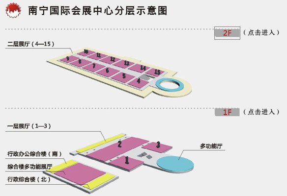 南寧國際會展中心由主建筑、會展廣場、行政綜合樓等組成,其中主建筑總建筑面積為15.21萬平方米,由會議、展覽和大型宴會廳三部分組成。會議部分包括會議中心、多功能廳、辦公場所等,擁有14個大小不同的會議廳(室),有功能齊全的聲擴設備、10+1同聲傳譯系統、電視會議系統、公共廣播系統、安防系統、計算機網絡系統、新聞中心等,能滿足各種國內國際會議、商務洽談和學術報告的舉行;朱槿花廳(多功能圓形大廳)使用面積2800平方米,能容納1500人會議、1000人宴會,是舉辦大型會議、展覽、宴會、演藝活動等的理想場所。大型宴會廳由能容納1000人同時就餐的大廳、34個包廂組成,裝飾格調高雅,環境舒適,是舉辦大型宴會和商務宴會的理想之地。展覽部分有兩層展廳,共有15個不同規格的展廳(最大展廳8100平方米,最小展廳2150平方米),展覽面積達4.8萬多平方米,可容納3360個國際標準展位。行政綜合樓建筑面積1.78萬平方米,由辦公場所、多功能展廳、展具加工間、倉儲用房等組成,同時配有可容300人的會議廳。主建筑展廳加上可搭建110個展位的朱槿花廳(多功能圓形大廳)、可搭建203個展位的行政綜合樓多功能展廳和集會廣場,展覽面積達8萬多平方米。此外,南寧國際會展中心還有用地面積3.56萬平方米、可停放1000多輛小汽車的生態停車場。